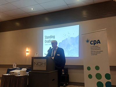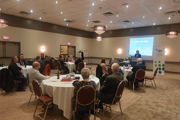 The evenings began with cocktail receptions where attendees enjoyed delicious hors d'oeuvres, beverages, and the chance to reconnect with colleagues and friends. Each event featured an engaging lineup, emceed by a local Chapter member, and included remarks from CPABC President and CEO Lori Mathison, who provided an insightful economic update relevant to the profession and local region. Additionally, CPABC Chapter Program Specialist Ashling Diamond delivered a brief presentation on the benefits and impact of Chapter volunteerism, encouraging members to deepen their involvement.